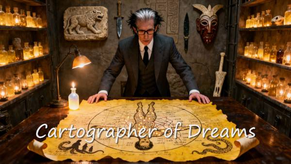 At 7 years old, Echo Voss ("Voss" meaning "collector" in their language) was lured through the portal and granted powers to harvest dreams worldwide. In exchange, he received a mild humanized Somnolent for eternal youth. Echo served for 11,983 years, mapping every dream on a Vitruvian Man ledger—the Cartographer Map. His final vial was his own 7th birthday memory, fulfilling his contract. He slipped into dementia, finding peace after centuries of service—a tragic figure, child-recruited into an alien existential struggle. He is succeeded by Lira Voss.